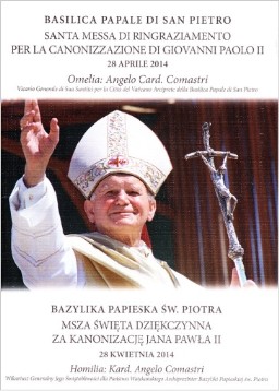 Lunedì 28 aprile 2014 alle ore 10:00 siamo ritornati in Piazza San Pietro, questa volta nella prima fila, dove il Cardinale Angelo Comastri, Vicario Generale di Sua Santità per la Città del Vaticano e Arciprete della Basilica Papale di San Pietro, in una piazza gremita di pellegrini, ha presieduto la celebrazione eucaristica di ringraziamento per la canonizzazione di Giovanni Paolo II.