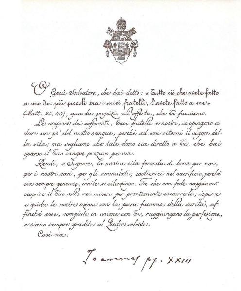 Vi è custodita anche la speciale preghiera composta da Giovanni XXIII e da tutti conosciuta come la "Preghiera del Donatore" e l'immagine che ricorda l'Udienza concessa ai Donatori di Sangue il 25 aprile del 1959.