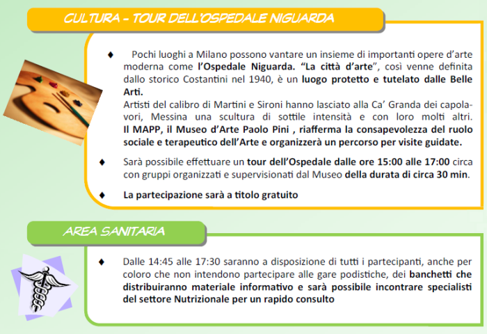 Il fulcro dell'iniziativa, saranno le gare podistiche (da 3, 6 e 9 km non competitive, con l’aggiunta della staffetta) che si snoderanno all'interno dell'Ospedale di Niguarda e nelle zone verdi limitrofe.