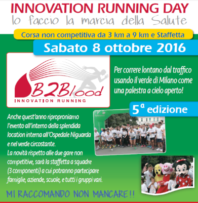 Sabato 8 Ottobre, presso l'Ospedale di Niguarda, si terrà la quinta edizione di INNOVATION RUNNING DAY, manifestazione annuale legata allo Sport e organizzata dall’AVIS di Milano per promuovere la donazione di sangue sul territorio milanese .
