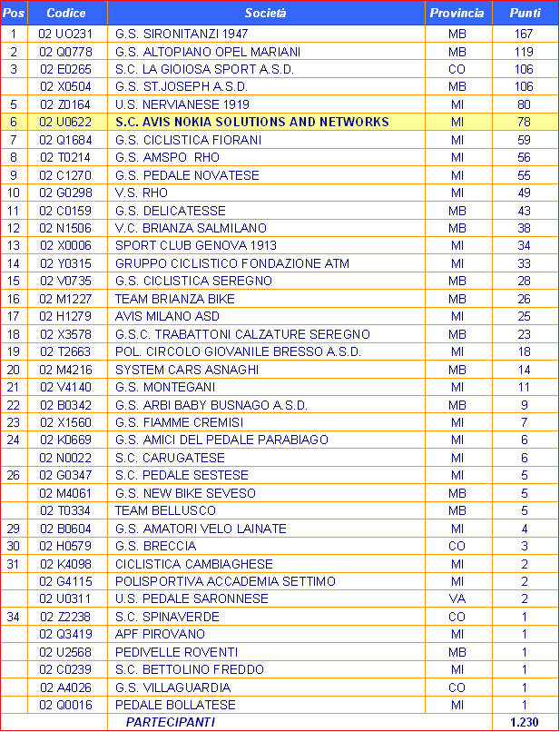 CLASSIFICA FINALE CAMPIONATO LOMBARDO