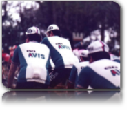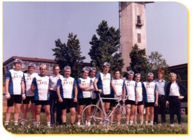 A fianco: i “precursori” dalla Squadra ciclistica Avis GTE con al centro il “capitano” Pasquale Bestetti. Primo da destra nella foto, Rolando Ceccagno, il primo presidente della Società. Le prime divise della Squadra.